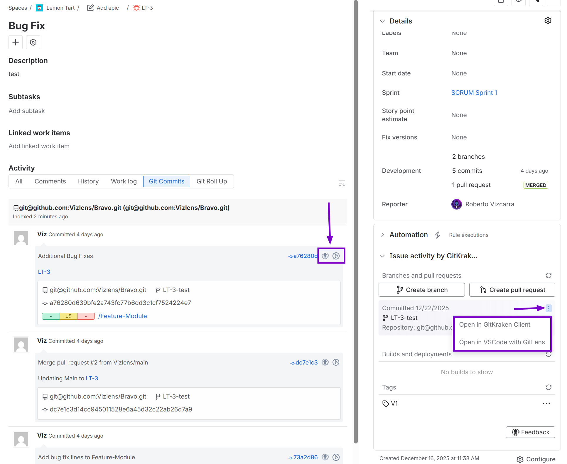 Git Integration for Jira supports deep linking from repositories, commits, branches, and tags into the GitKraken Git client and GitLens VS Code extension.