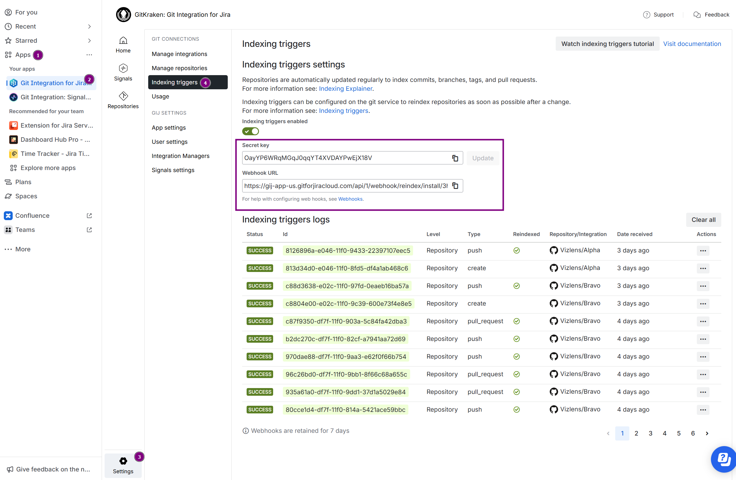 Switch to your Jira Cloud instance and navigate to Apps ➜ Git Integration: Manage integrations then click Indexing triggers on the sidebar.