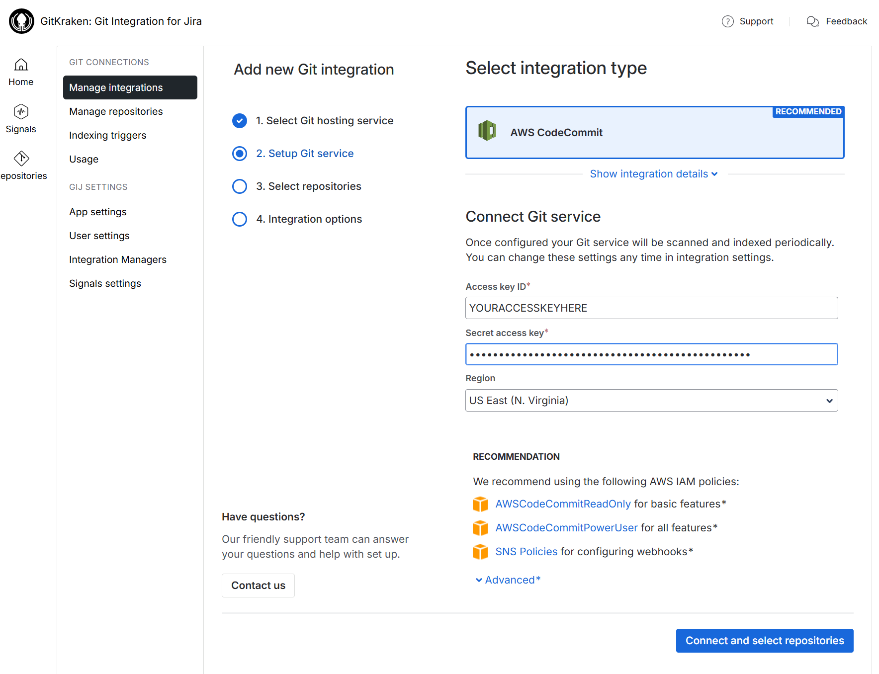 We recommend using the Full feature integrations panel (formerly Auto-connect integration panel) to connect multiple repositories from your AWS CodeCommit git host.