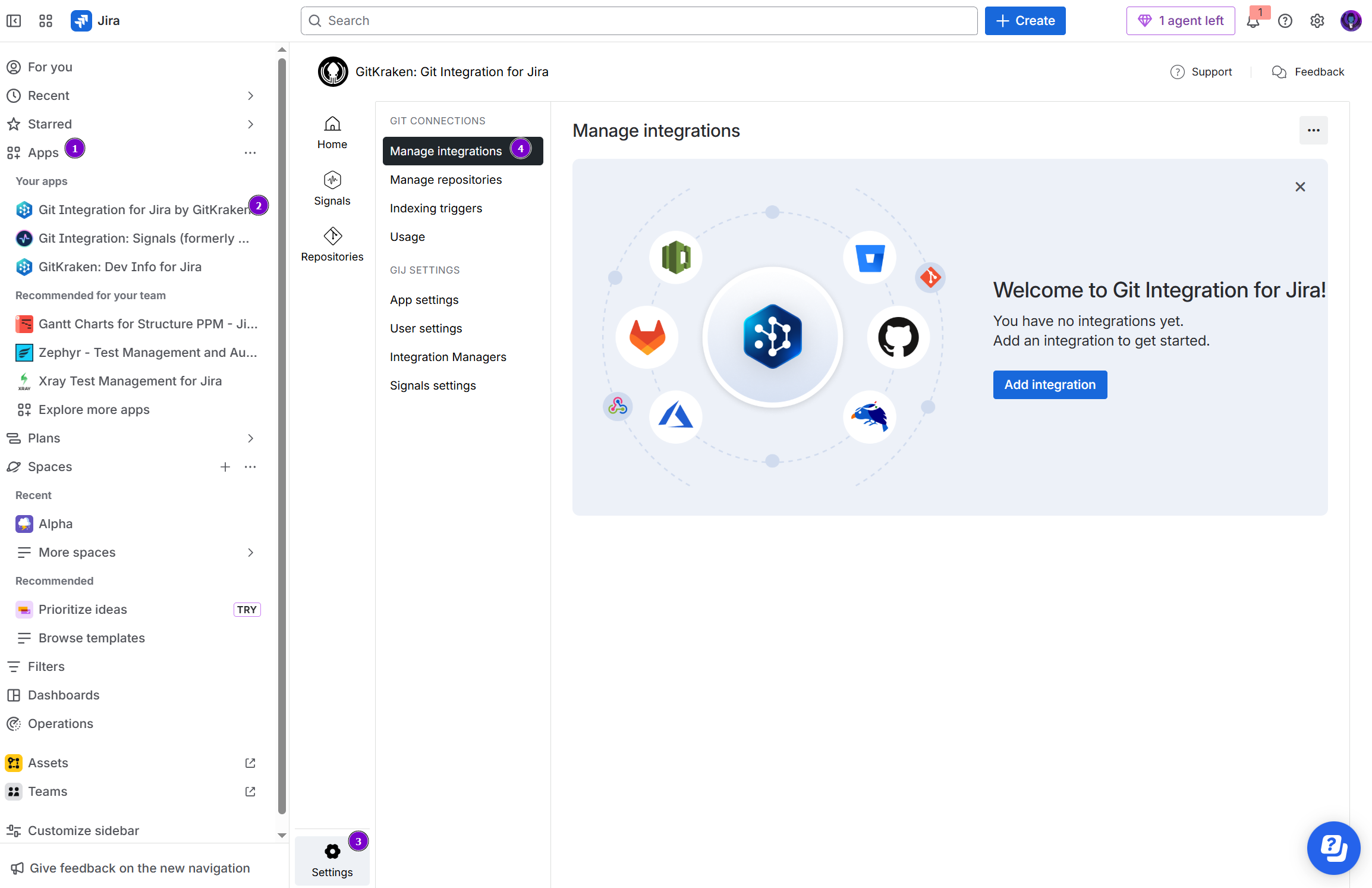 On your Jira dashboard menu, go to Apps ➜ Git Integration: Manage integrations.