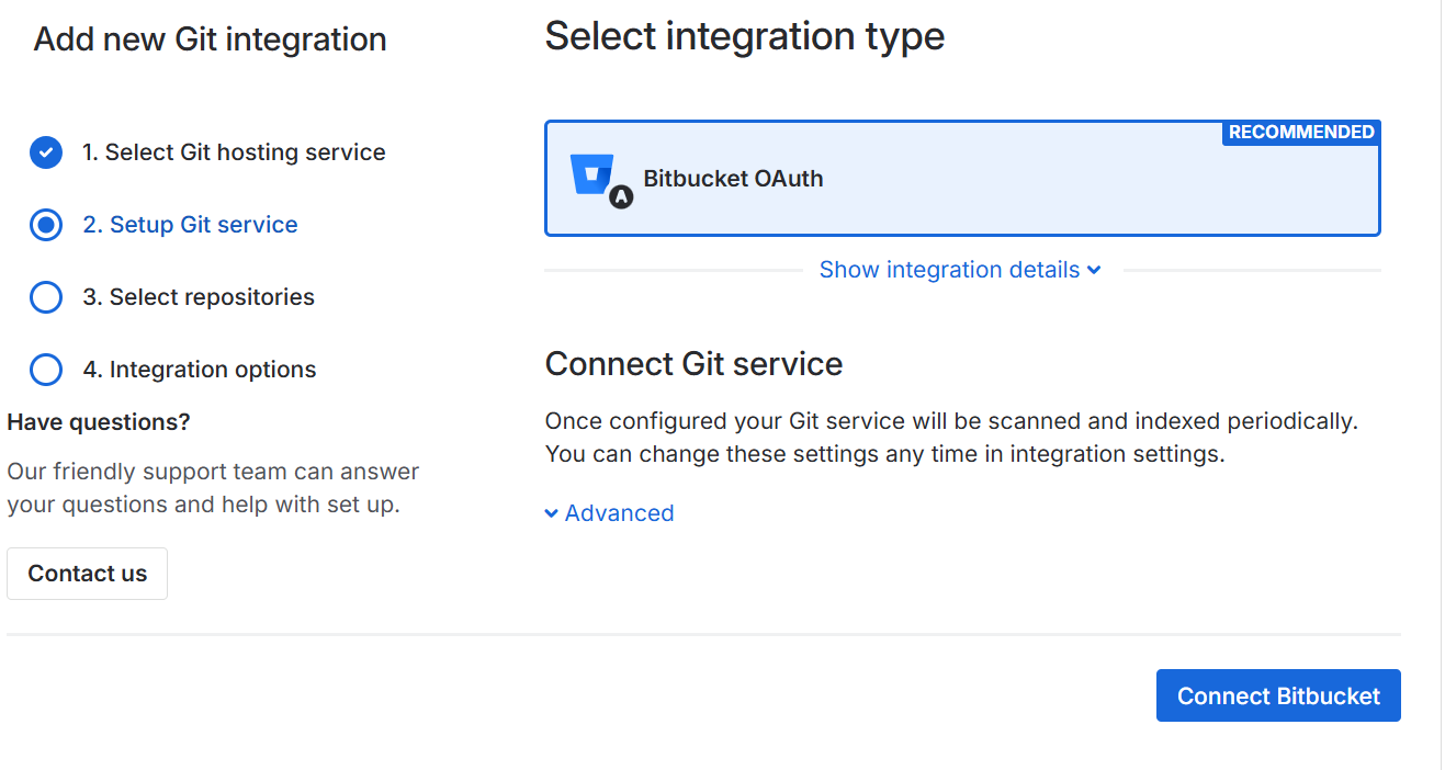 For the following screen, click Bitbucket.org to start integration with this git service.