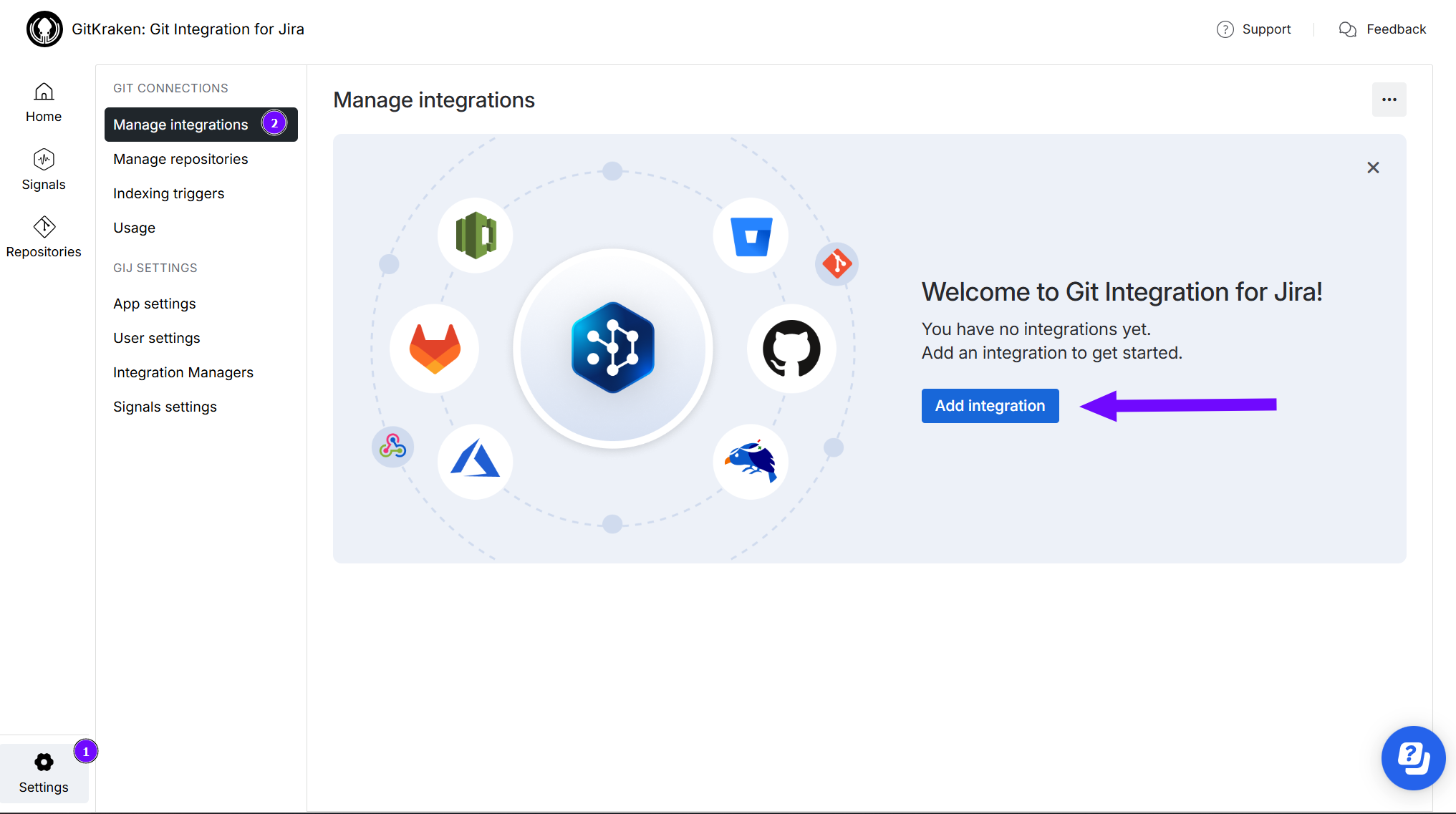 On your Jira side bar, go to Apps ➜ Git Integration for Jira, then Settings ➜ Manage Integrations