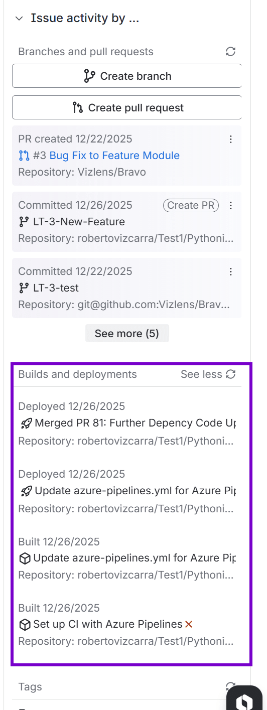 When an issue associates with a build or deployment, additional information appears in the right-hand panel.