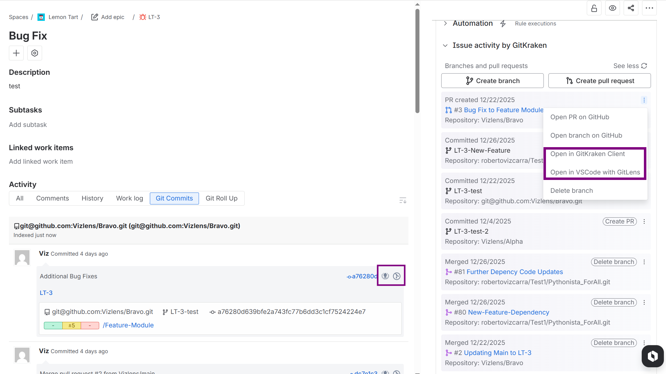 On the Commits tab, click Open in GitKraken to open this commit in the GitKraken git client.