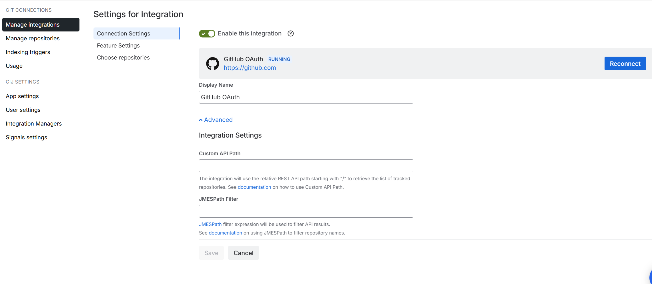 The connection settings page contains configuration options to manage integration connection and displayed repositories.