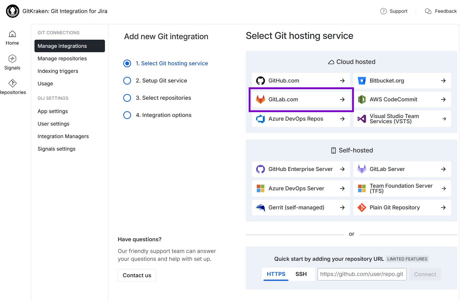 On the following screen, click GitLab.com to start integration with this git service.