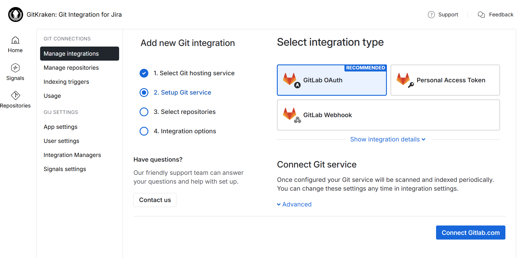 We recommend the OAuth integration which is outlined like a setup wizard, making it easier for users to connect GitLab integrations.