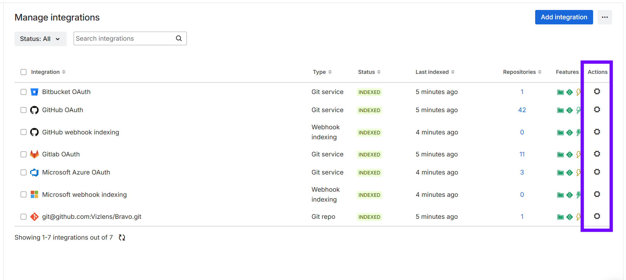 On the git integration configuration page, you can manage connected integrations by adding, editing, updating settings, or disconnecting integrations and repositories.