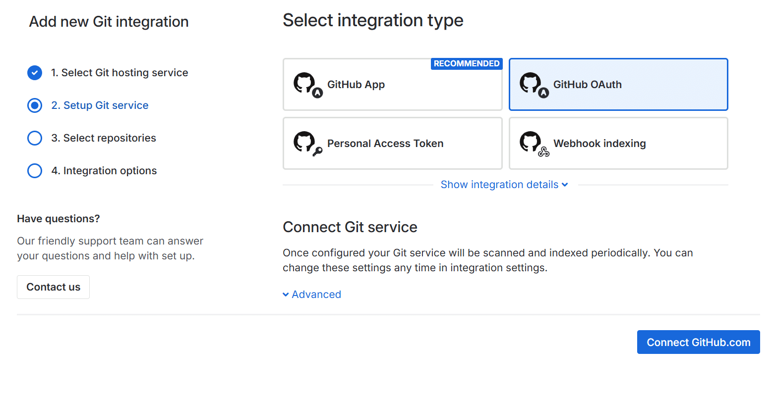 | Git host service | OAuth integration | PAT integration | Webhook indexing |