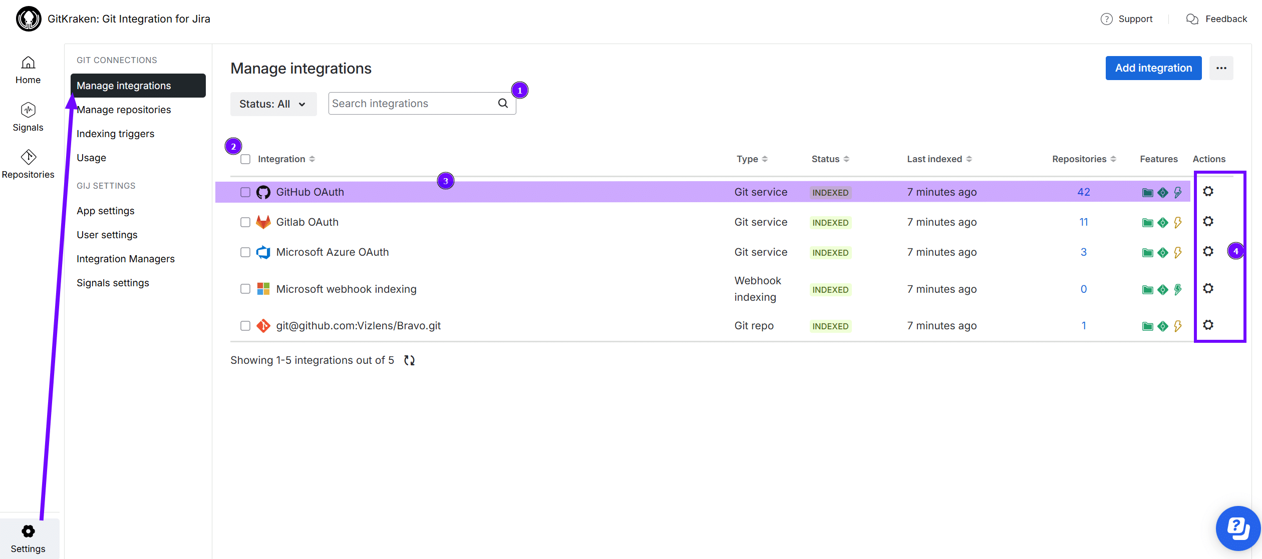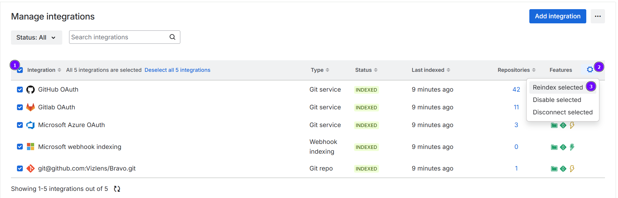 Use the checkbox to select specific integrations/repositories from the list. Pair this with actions to perform multiple configuration for selected items.