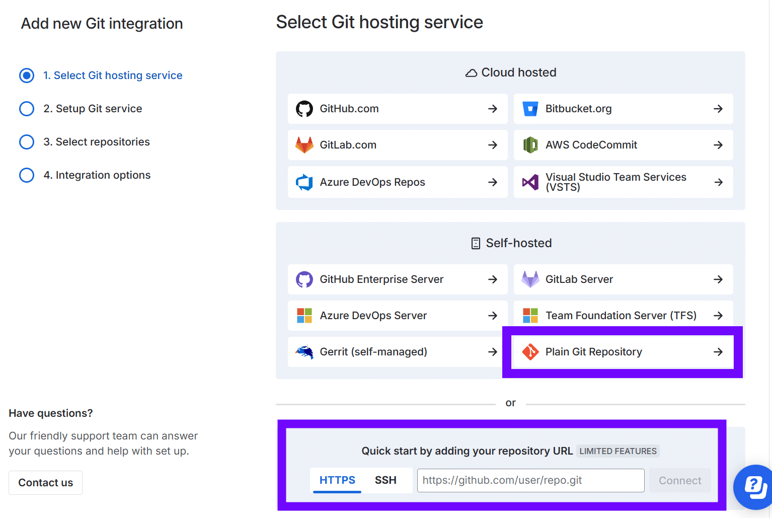 Plain Git integration – manually connect single HTTP/HTTPS or SSH git repositories into Jira. See supported Remote Git URL examples in the connection wizard.