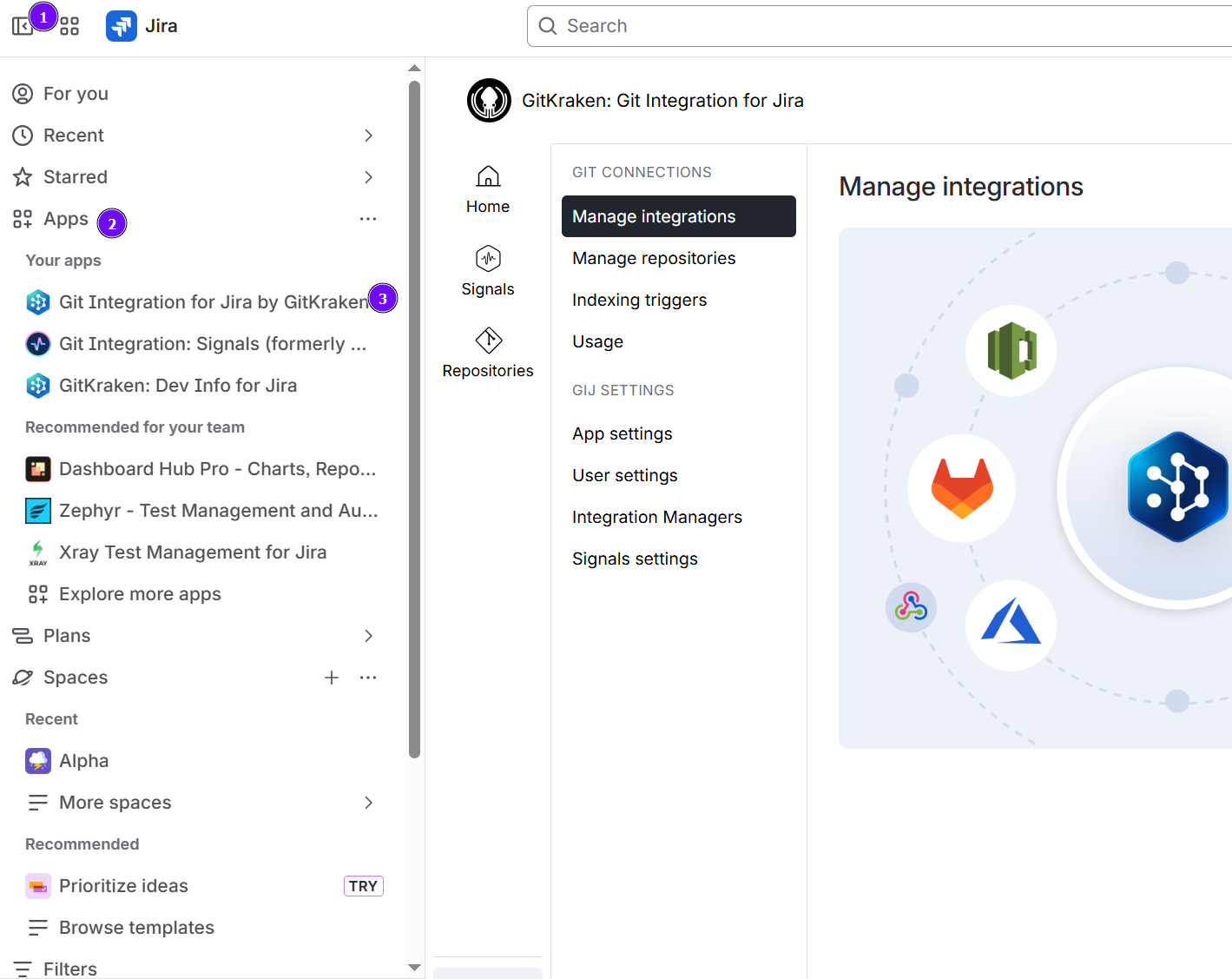 Jira dashboard menu Apps ➜ Git Integration: Manage integrations