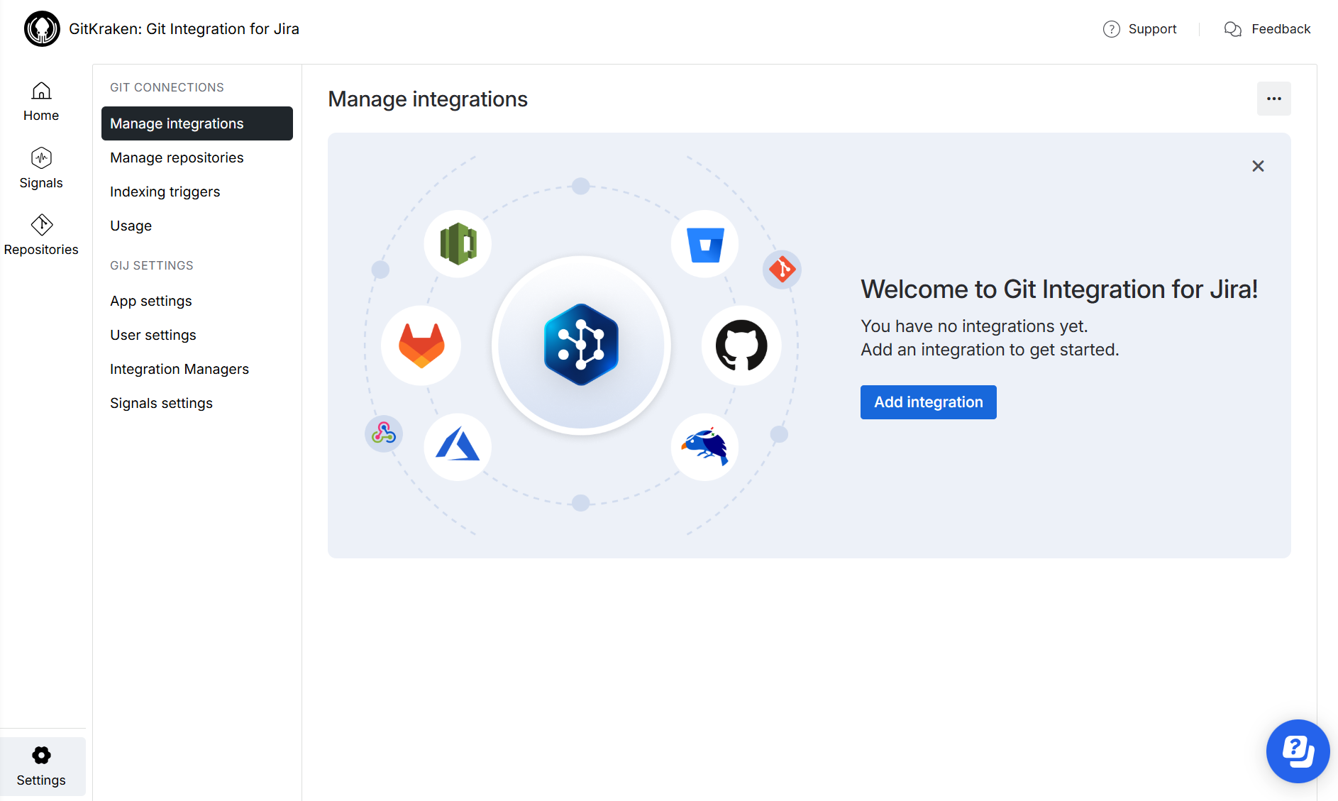 Integrate your git repositories via Git Integration for Jira Cloud. The app provides special integrations with GitHub, GitLab, Azure Repos, and more. Start integrating your git repositories by clicking Add integration.