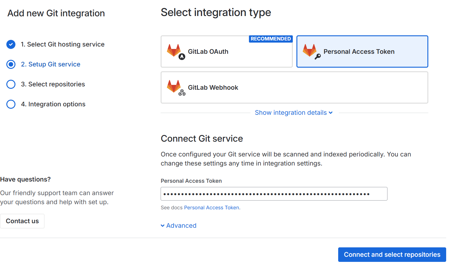 Git service integration – supports automatic connection and configuration of integration repositories using your Git service account or PAT.