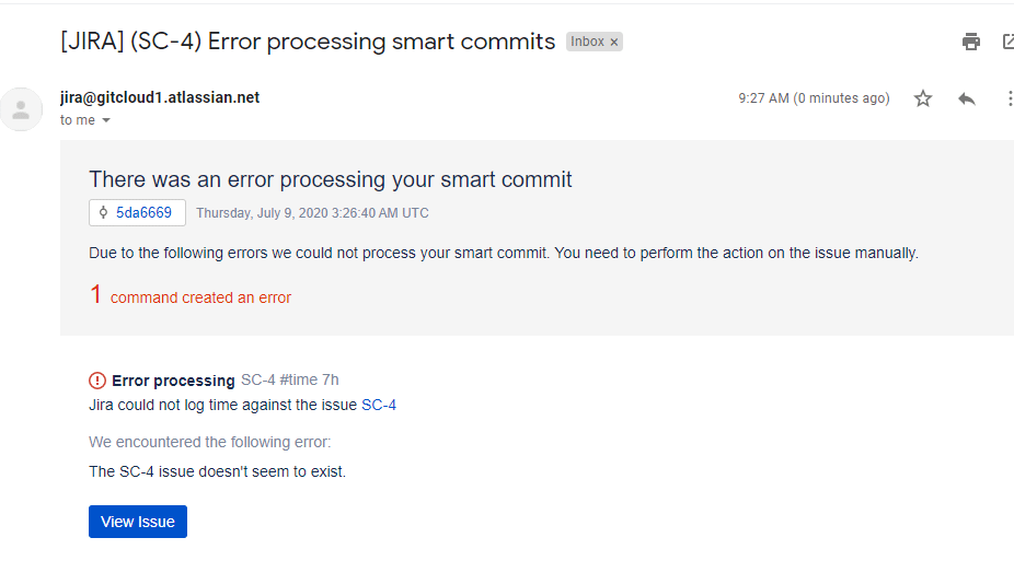 Sometimes users make mistakes in constructing smart commits syntax or try to use the name of the transition which is not available for the current issue status. In these cases, users receive smart commit errors via email notifications.